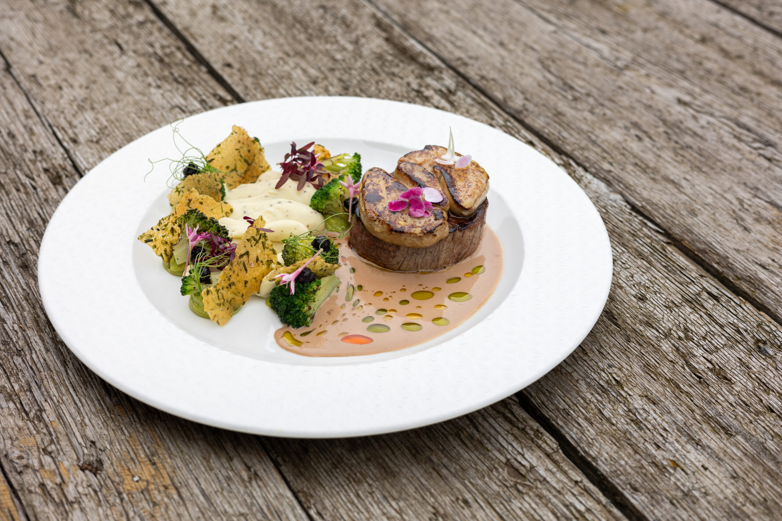 Marhabélszín, füstölt bors, Padron paprika, burgonyakrém, makói hagyma